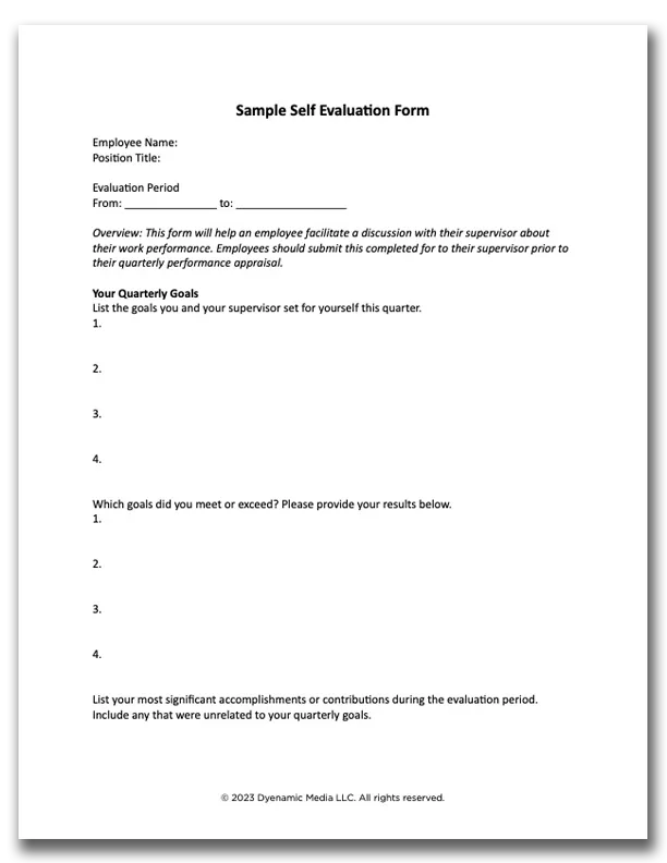 Be prepared for your performance review! Fill out this self-evaluation prior to meeting with your boss. If you manage any direct reports, have them fill it out and return it to you before their review.